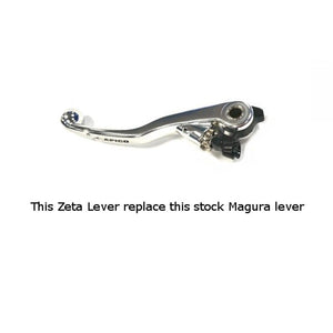 Zeta 3 finger CP folding levers are CNC machined alloy levers. These levers fold forward in a crash rather than bend or brake. They feel nice on the fingers and have the added bonus that you can change the lever position relative to the handle independently from the lever throw. These come in a titanium anodized finished. This clutch lever fits, KTM Husky and Husaberg models that use the late Magura clutch master cylinder, use bike selector for exact application.