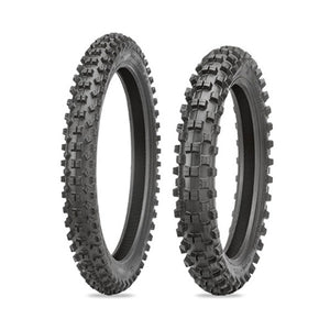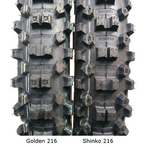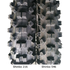 The Shinko 546 is an all round terrain knobby tyre. The rear tyre has large tall knobs that are spaced like a soft terrain tyre with big gaps for clearing the dirt. The hardish rubber compound offers extra durability and reduces knob flex for great drive and braking traction. The front tyre has diamond shaped side knobs that cut into the terrain at lean angles offering precise steering. Mini sizes are available.