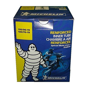 Michelin make the heavy duty MFR/MGR tubes from a flexible butyl rubber compound. These tube are overlapped spliced together which is stronger than the more conventional butt splice process. They are a bit lighter than the V Rubber heavy duty tubes eg 110/90-19 rear weights 915 grams, the V Rubber weighs in at 1250 grams. Note Michelin dont know how to sell reinforced.