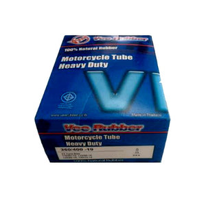 Inner tubes by Vee Rubber. These tubes are made in Thailand from 100% natural rubber. These are great quality flexible tubes. Most have the steel straight valve stem with the nuts and valve caps (TR4). The 500/510-16 and some 10 inch tubes have the 45 degree off set steel valve(TR87). By our standards the Vee Rubber blue box is a standard tube at 1.5mm thick even though they call it heavy duty . The yellow box which they call ultra heavy is by our standards just heavy duty. The 170/80-15 tube has a PV78 valve which is a steel threaded valve with a 90 degree bend.